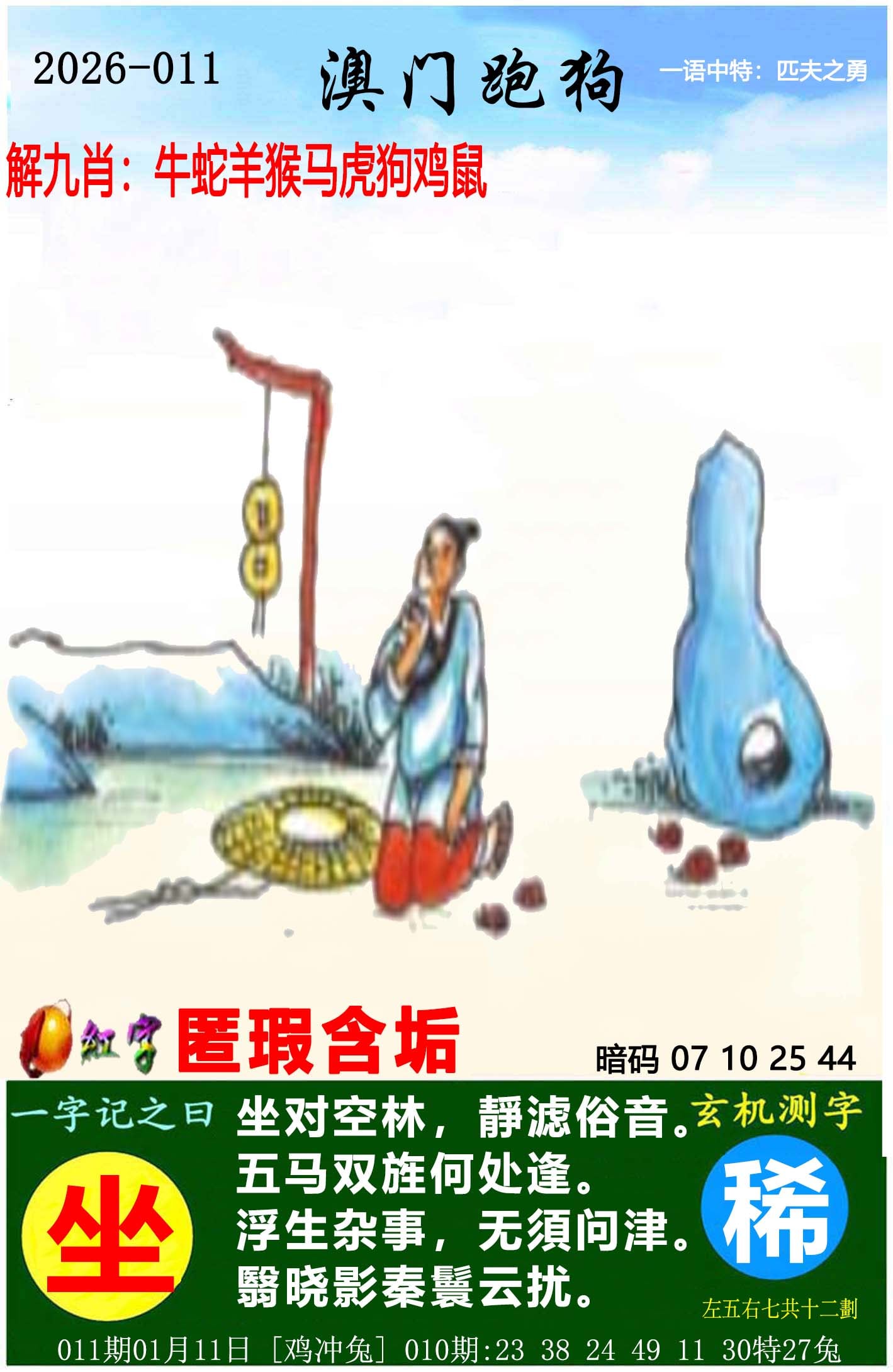 011期开奖时间2026年01月11 星期日)晚9:30开(农历十一月廿三 鸡冲兔)011期【欲钱买牛虎舞春的生肖】